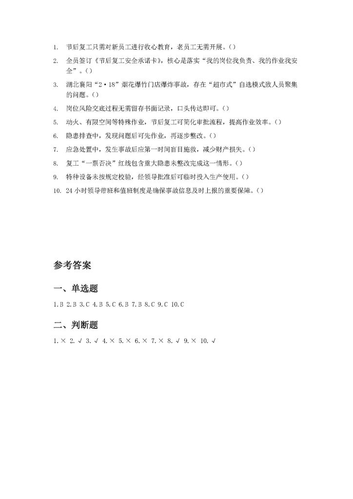 ESH安全管理 » 260224-2026年复工安全第一课:全员收心归位培训-考试卷